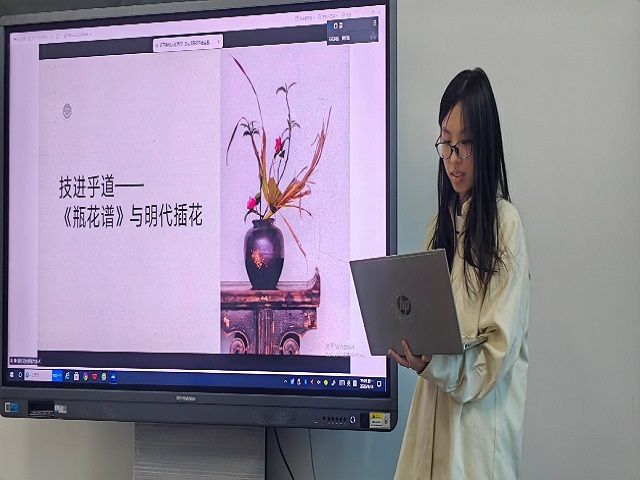 倪根金教授在点评中充分肯定了分享的普及作用与“理论结合实践”的教学设计,同时指出黄忻瑶划定的插花史分期的相关问题,并对古籍版本提法做出纠补。黄忻瑶同学随后现场演示了中式插花技法,带领同学们学习手打螺旋,将“取俯仰高下,疏密斜正”的典籍论述化为指尖体验。