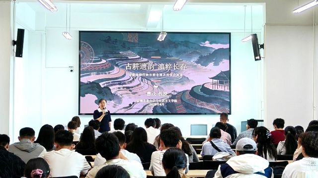 讲座由云南农业大学马克思主义学院教授曹茂主讲,她以“引言、瑰宝、挑战、未来”为脉络,为在场师生铺展了云南农耕非遗的鲜活画卷。从非物质文化遗产的核心概念与中国农耕文明的乡土特质开篇,立足云南多元民族文化特征,系统梳理云南代表性农耕非遗项目,重点讲述了技艺、歌舞和民俗三种类型的代表性非遗项目,如普洱茶制作技艺、哈尼族四季生产调、景颇族目瑙纵歌、白族栽秧会等非遗中的农耕文化印记。同时,分析了非遗传承面临的三大挑战:现代化冲击与传承断层、生态环境压力与传统智慧式微、商业化开发与文化本真性丧失。曹茂以典型案例为依托,分享了阿者科计划、数字化保护与传播、非遗进校园等保护模式,为新时代农耕非遗的保护与传承提供了鲜活案例。